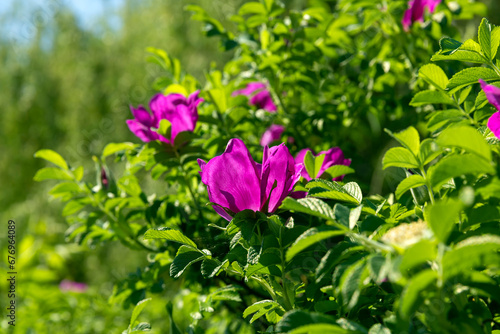 © rsooll, Obraz premium rosehip bush with red flowers in spring
