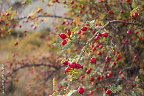 © Виктория Попова, Obraz premium Rosehip fruits on a branch in a soft light. Rosehip bush. Selective focus