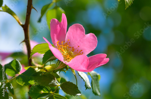 Obraz premium Rosehip, wild rose, blooms among green leaves