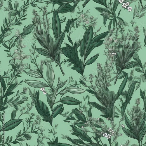 Fototapeta premium Rosemary and mint in a herb seamless pattern. AI generated.