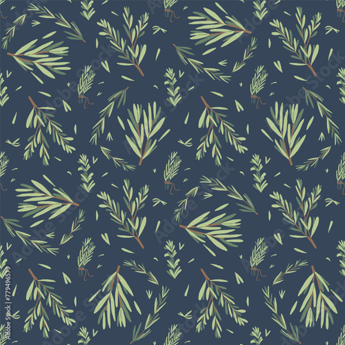© Syuzann q, Naklejka premium Rosemary herbs branch seamless pattern. Rosemary plant green leaves repeat background. Botanic dark endless cover. Vector simple hand drawn illustration.
