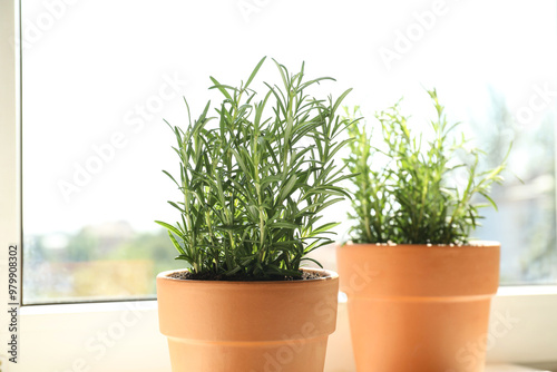 © New Africa, Obraz premium Rosemary plants growing in pots near window, closeup. Aromatic herb