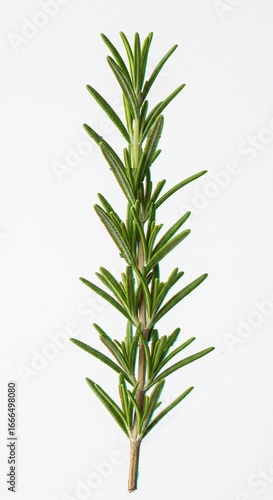 Fototapeta premium Rosemary sprig close-up, showcasing needle-like leaves and textured stem against a white background