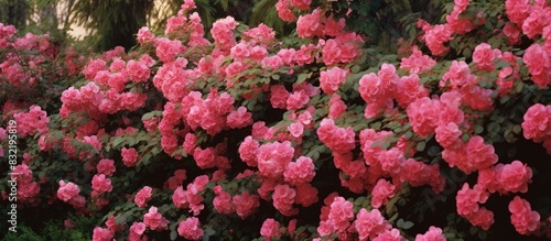 © HN Works, Naklejka premium Roses are blooming in the hedges. Creative banner. Copyspace image