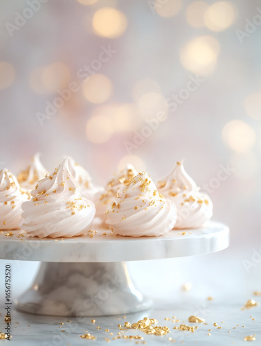 © Onirama, Fototapeta premium Rosewater meringue nests with edible gold flakes on marble stand