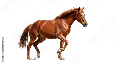 © Nguyen, Naklejka premium Rostbraunes Pferd elegant im Schritt vor hellem Hintergrund. AI Generated