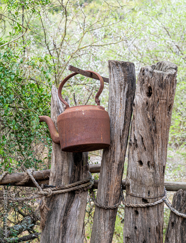 Fototapeta premium Rostiger Wasserkessel hängend am Holzzaun