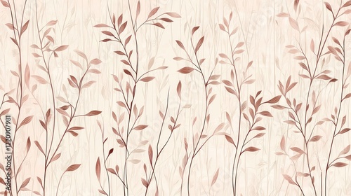 © wikkie, Naklejka premium Rosy Botanical Wallpaper: Elegant Rose-Hued Branch and Leaf Design