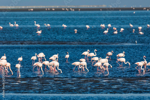 Fototapeta premium Rosy Flamingo colony in Walvis Bay Namibia
