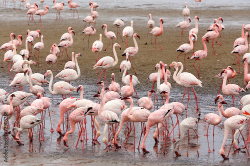 Fototapeta premium Rosy Flamingo colony in Walvis Bay Namibia