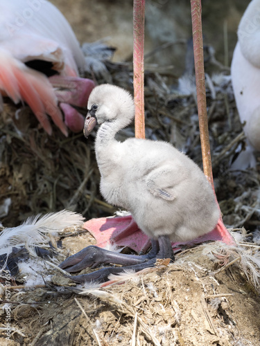 © vladislav333222, Naklejka premium Rosy Flamingo, Phoenicopterus ruber roseus, with a small chicken