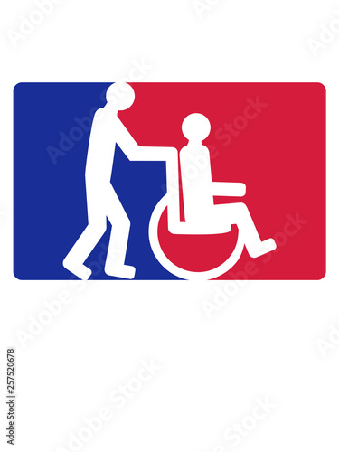 Fototapeta premium rot blau rollstuhl schild 2 freunde team paar schieben behinderung gehen...