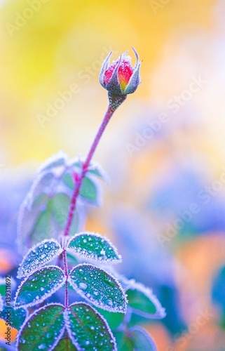 Fototapeta premium Rot- gelbe Rosenknospe steht von Eiskristallen überzogen bei Wintereinbruch...