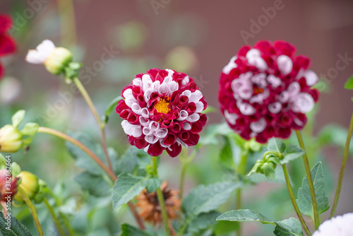 © Julia, Obraz premium Rot weiße Pompon Dahlie