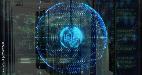 Fototapeta premium Rotating blue holographic globe emitting data streams in server room, with HUD overlays and racks