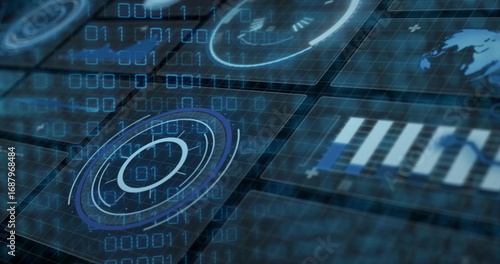 Obraz premium Rotating central circular HUD interface on command center console, with digit streams and bar chart
