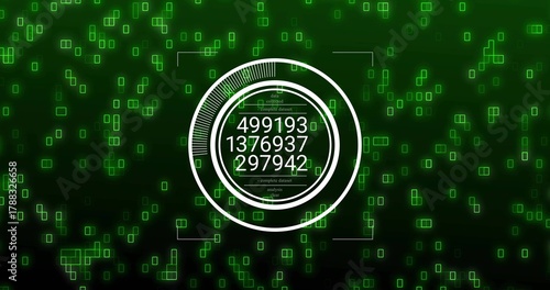 Naklejka premium Rotating central white ringed HUD showing stacked numeric readouts on digital UI neon-green grid