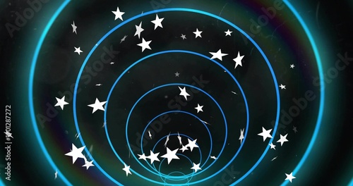 Obraz premium Rotating concentric neon-blue rings creating tunnel in digital space, with white stars