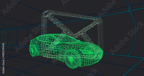 © vectorfusionart, Obraz premium Rotating neon-green wireframe car model being scanned inside virtual chamber, with particle gantry