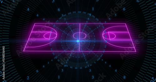 Fototapeta premium Rotating neon purple basketball court schematic on HUD, with radial grid...