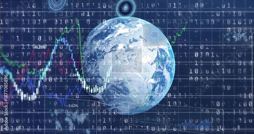 © vectorfusionart, Obraz premium Rotating rendered Earth globe showing colored financial charts in virtual grid, with binary overlay