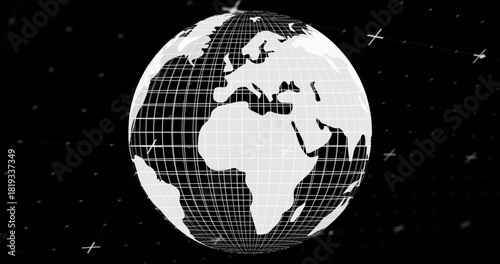 © vectorfusionart, Fototapeta premium Rotating wireframe globe showing Africa Europe Mideast shapes in dark void with grid, stars, guides