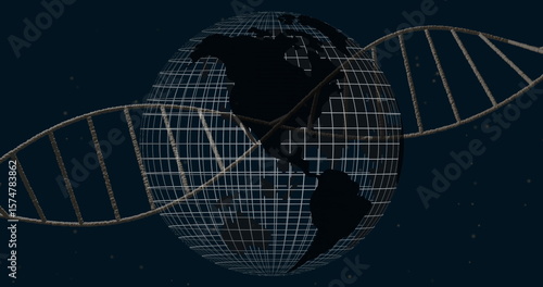 Fototapeta premium Rotating wireframe globe wrapping around twisting DNA double helix in space motif, navy-blue stars