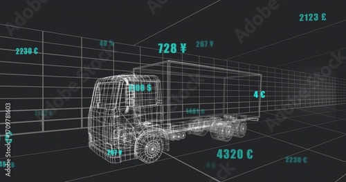 © vectorfusionart, Obraz premium Rotating wireframe semi-trailer truck model floating in grid, displaying turquoise currency values