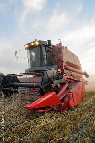 Fototapeta premium Roter Mähdrescher bei der Ernte, am Abend