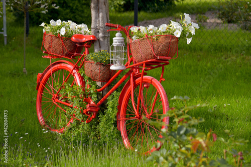 © Henry Czauderna, Fototapeta premium rotes Fahrrad mit Blumenbepflanzung als Dekoration im Garten