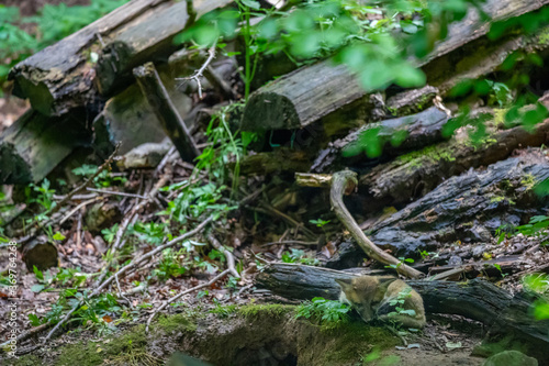 Obraz premium Rotfuchswelpe (Vulpes vulpes) am Bau, Deutschland, Europa