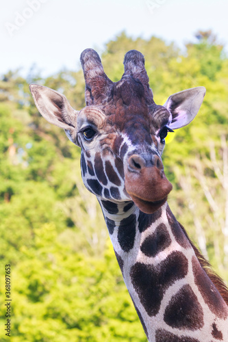 Fototapeta premium Rothschild's Giraffe - Giraffa camelopardalis rothschildi - head portrait. The background is blurred with a photo style and the photo has a nice bokeh.
