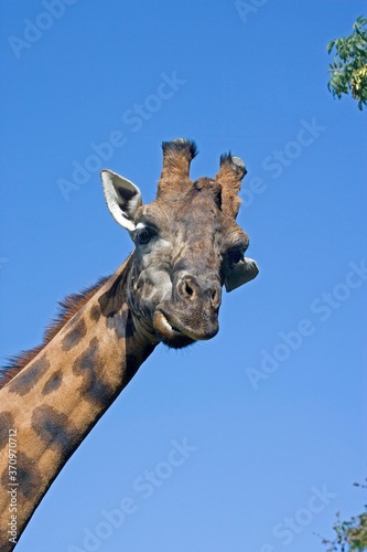 Fototapeta premium Rothschild's Giraffe, giraffa camelopardalis rothschildi, Portrait of Adult,...