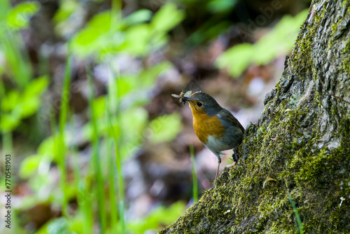 Fototapeta premium Rotkehlchen (Erithacus rubecula) mit Insekten
