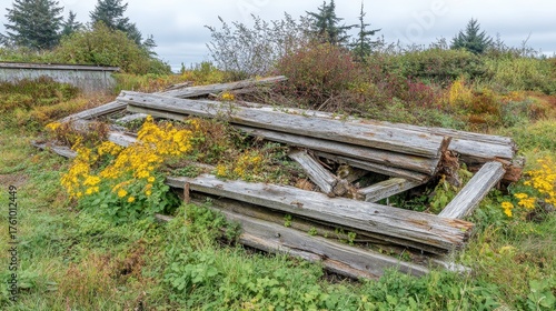 © AszmiStock, Obraz premium Rotted Wooden Beams Deteriorating Outdoors in a Natural Landscape