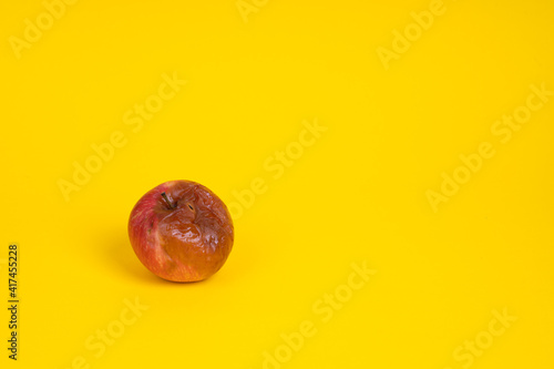 Fototapeta premium Rotten apple with a worm on a uniform yellow background