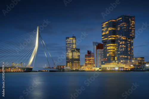 Naklejka premium Rotterdam city skyline cityscape, Netherland (Holland) at night. View of downtown and Erasmus bridge