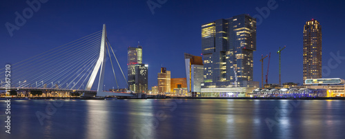 © rudi1976, Fototapeta premium Rotterdam Panorama. Panoramic image of Rotterdam, Netherlands during twilight blue hour.