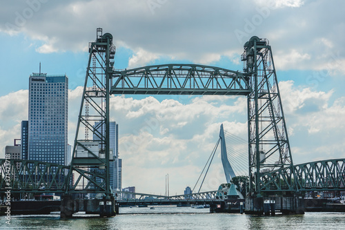 © sherkeen, Fototapeta premium Rotterdam South Holland/Netherlands -June 11 2020 : beautiful view of De Hef Bridge in Rotterdam.