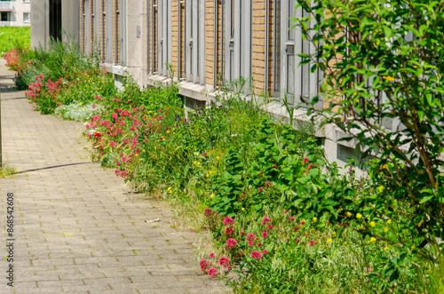 © Frans, Fototapeta premium Rotterdam, The Netherlands, June 19, 2024: grasses and wildflowers growing abundantly in a narrow garden strip along the facade of a brick building