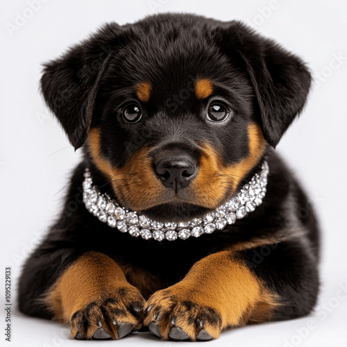 © Tasha, Fototapeta premium rottweiler puppy with a diamante necklace isolated on white