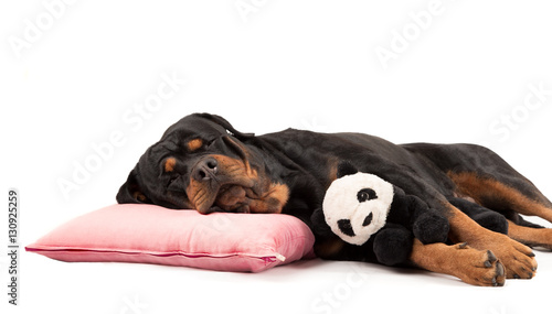© tnoronen, Fototapeta premium Rottweiler sleeping hugging toy panda