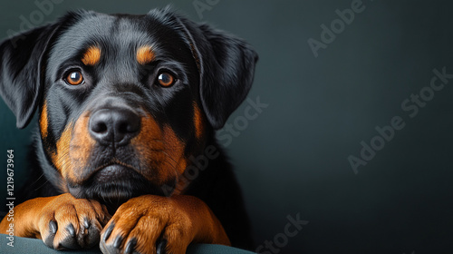 © Ольга Бошарова, Fototapeta premium Rottweiler with Thoughtful Expression against Dark Background