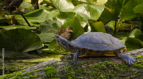 © Johannes Menk, Fototapeta premium Rotwangenschildkröte auf einem Baumstamm