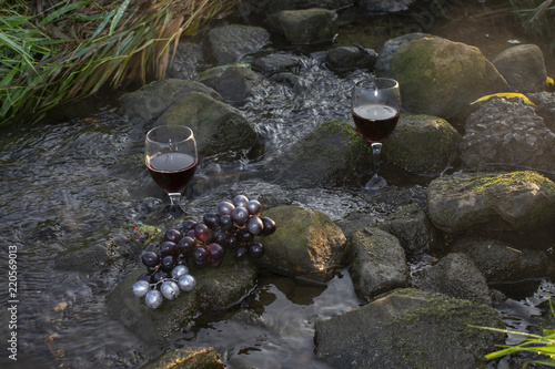 © Stefanie, Fototapeta premium Rotweingläser und roten Weintrauben auf Steinen im fließenden Gewässer.