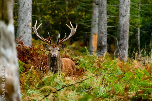 Naklejka premium Rotwild Cervus elaphus Hirsch Bock Geweih Lichtung Rotwild Sonne Tarnung Sauerland Jäger Jagd Deutschland Freiheit Camouflage Wald Herbst scheu Fluchtinstinkt Blick Augen Wildwald Reservat