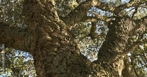 © Barry, Obraz premium Rough bark of wild cork tree in Portugal from below in spring