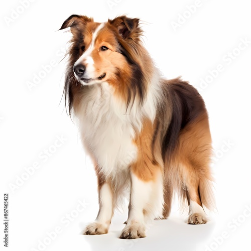 © Toseef, Fototapeta premium Rough collie dog breed standing against white background, AI Generated
