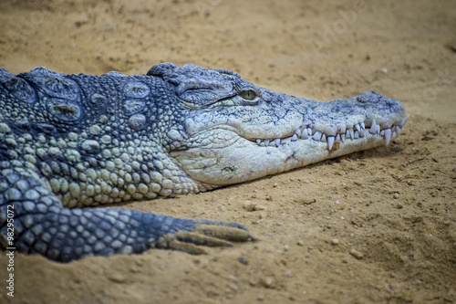 © Outsiderzone, Obraz premium rough crocodile resting on the sand beside a brown river