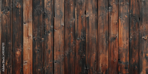 © AI_images, Naklejka premium Rough-hewn wooden backdrop featuring raw, unfinished planks with a dark, earthy brown color. The wood surface is textured with visible grain, knots, and cracks, creating a rustic, natural feel perfect